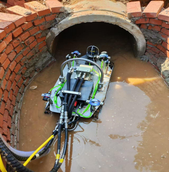 管道清淤機器人采用液壓驅(qū)動、履帶式行進方式,具有良好的通過性能,配備攝像頭與避碰聲吶,有效探測設(shè)備周圍環(huán)境狀況,前端配備兩組高壓噴頭及吸污口,可實現(xiàn)管徑≥800mm市政管道的高效清淤。